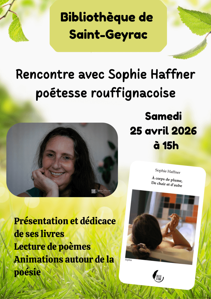 Le 25 avril 2026 de 15h à 17h Sophie Haffner aura la joie de vous lire des extraits de ses 4 livres poétiques Belle confluence, La nuit n’a pas sommeil, A corps de plume de chair et d’aube, La lune noire , d’échanger avec le public et de vous dédicacer ses livres dans le sillage du printemps des poètes consacré à la Liberté en 2026.