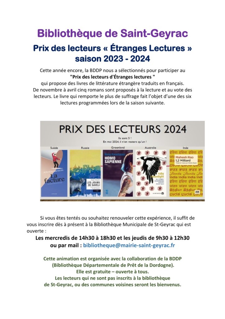 Prix des lecteurs: étranges lectures 2023-2024 Le 17 novembre 20219 novembre 2023 par Christinedans Saint-Geyrac Partager : Cliquer pour partager sur X(ouvre dans une nouvelle fenêtre) X Cliquez pour partager sur Facebook(ouvre dans une nouvelle fenêtre) Facebook J’aime chargement… Similaire