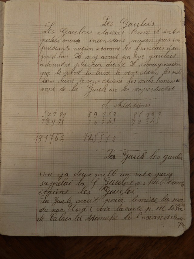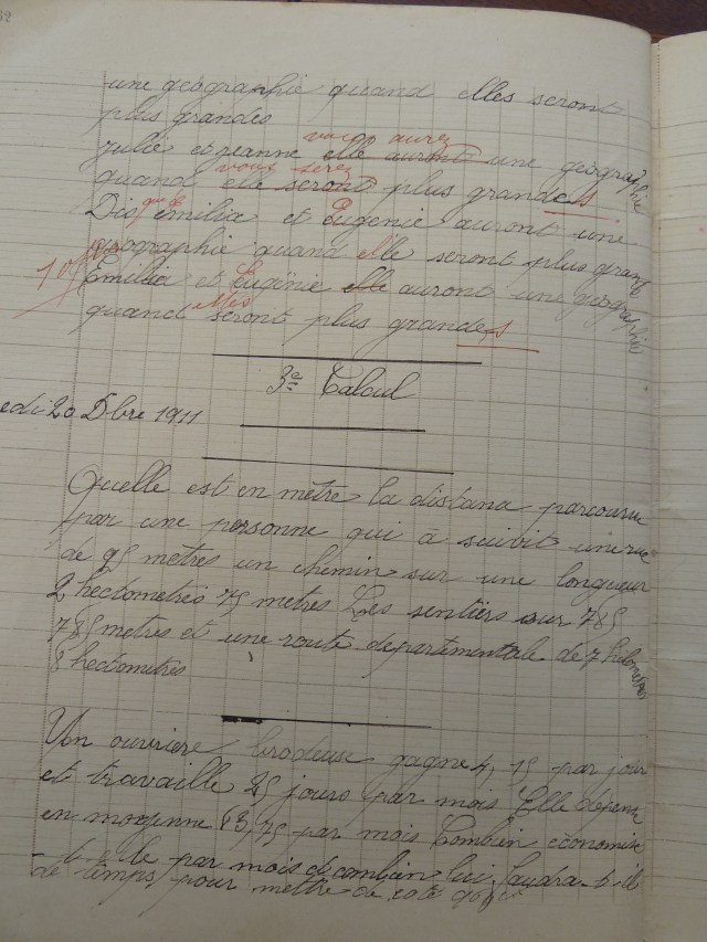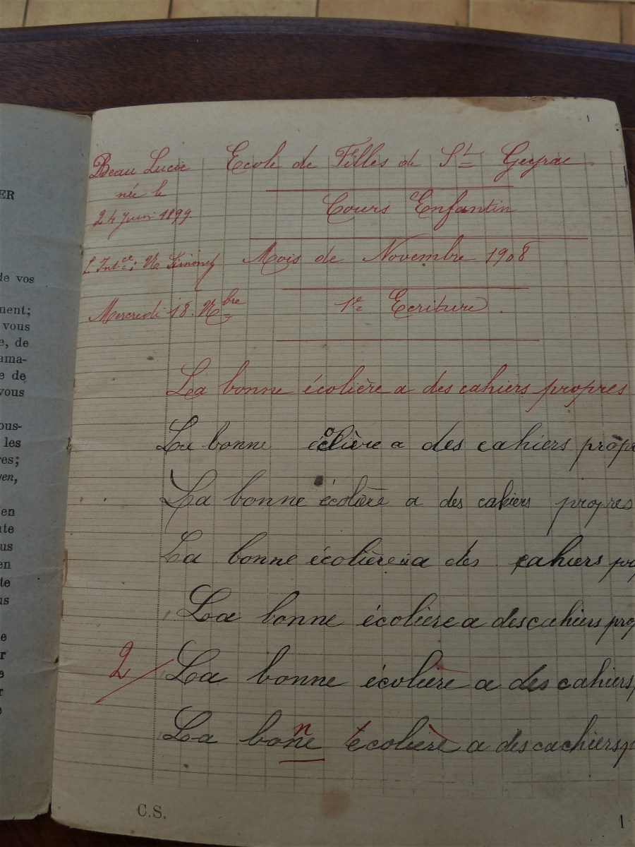 Voici des pages des cahiers de Lucie Beau, leur fille, née le 24-06-1999 à Saint Geyrac. Elle épousera Léo Chadrou le 30-10-1922 dans notre Commune et sera la mère de Léontine Théodore. L’expression « cours enfantin » n’a pas la valeur que nous lui connaissons. A cette époque il y avait la classe des grands et la classe des petits confiée à Madame !