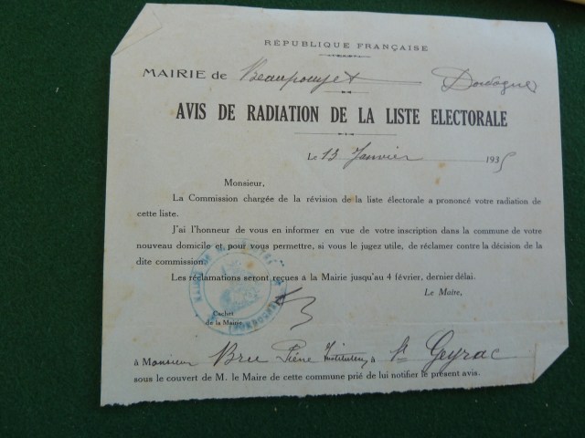 Saint-Geyrac a reçu de la Mairie de Beaupouyet un avis de radiation de la liste électorale en date du 13- 01-1935.