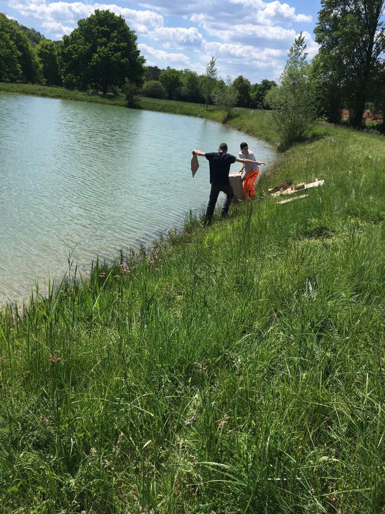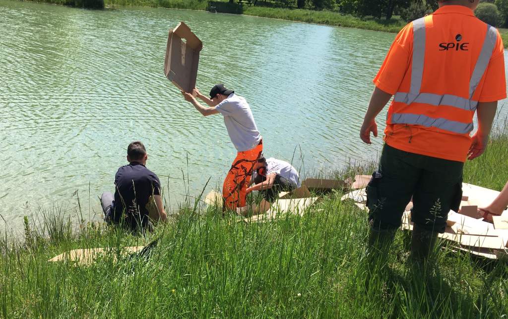 La météo estivale a nécessité des temps de pause à l’ombre et une bonne hydratation. L’étape de trempage des cartons dans l’étang a été très appréciée. Les élèves ont pu observer quelques sauts de poissons… Les cartons mouillés ont été déposés dans l’alignement de la future haie puis recouverts d’herbe de tonte et de paille pour préparer le sol à la future plantation.