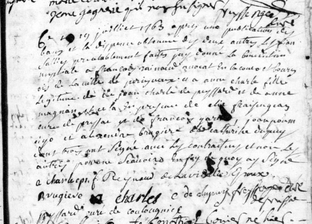 Le 18 juillet1763 on trouve sur les registres de St Front un acte de consentement pour délocaliser son mariage à Preyssac . Son épouse est Anne Charle Preyssard . C’est le curé Preyssard de Coulounieix ( probablement membre de la famille) qui assurera le mariage.