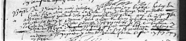 «Le 3 octobre (1673) je soussigné ay baptisé Hélies Lacoste fils à Mr Antoine Lacoste juge de La Douze et à Galliotte Andrieux mariés habitant de la Gélie paroisse de Saint Félix nay le 24 septembre ont été faits parrain et marraine Hélies Andrieux du bourg du Bugue et Louyse Lacoste du village de La Cotte paroisse de St Geyrat où je fis ce baptême à la place du Curé de Saint Félix qui est … M… … … à se loger, dans ces lieux s’étant accouchée la dite Galliotte Andrieu à Saint Geyrac y étant venue faire baptiser, en foy de quoi.»