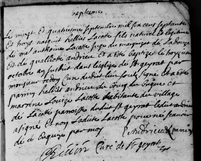 « Le 24 septembre 1673 naquit Hellies Lacoste fils naturel et légitime de Messire Anthoine Lacoste juge du marquisat de La Douze et de Galliotte Andrieu et a été baptisé le 3 octobre an susdit(1673) dans l’église de Saint Geyrac par Monsieur Redon Curé dudit lieu sous signé et a été parrain Hellies Andrieu du bourg du Bugue et marraine Louize Lacoste habitante du village de La Cotte paroisse du-dit St Geyrat Le dit Andrieux a signé et non Ladite Lacoste pour ne savoir de ce en quoi par moy Redon curé de St Geyrat»