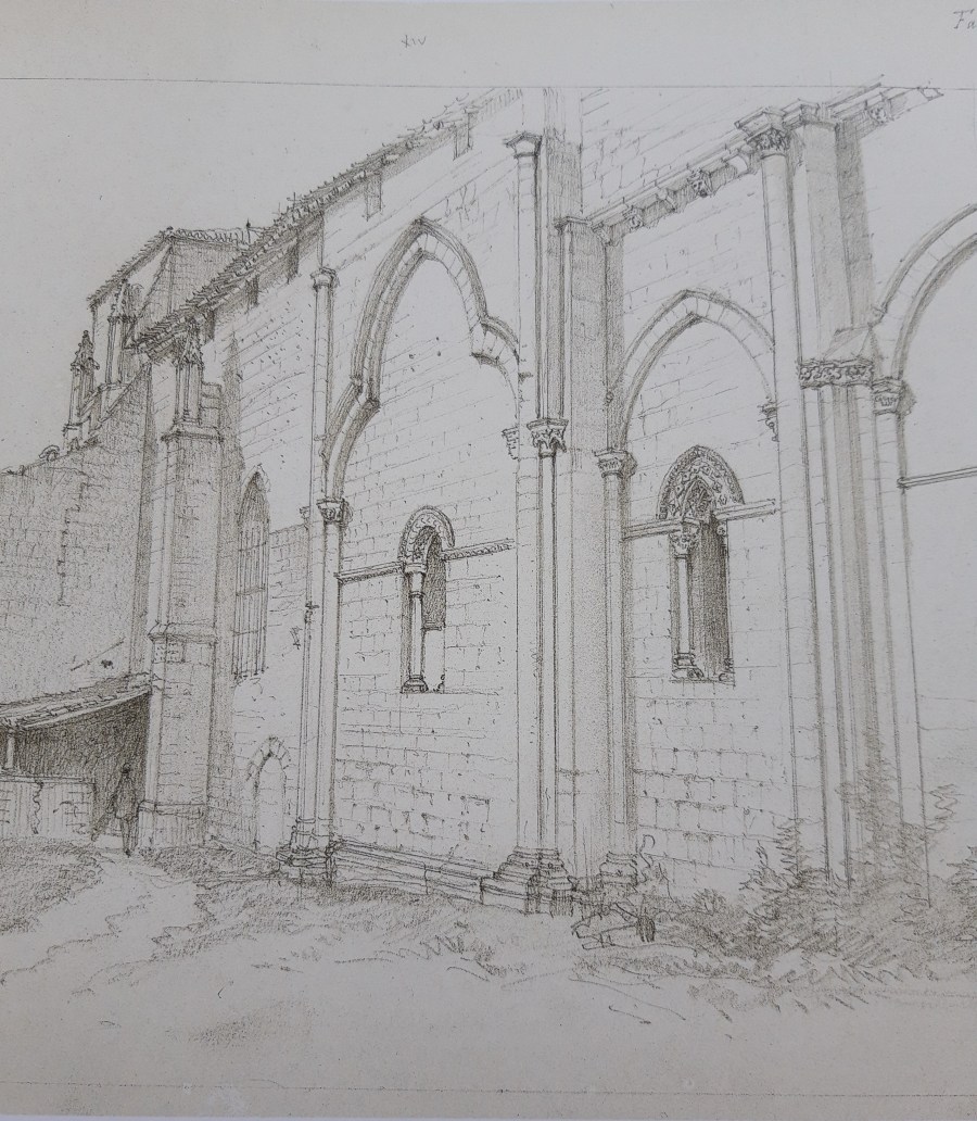 Image mise en avant : Léo Drouyn-façade méridionale de l’église de Pujols 13 juin 1878-dessin au crayon- Léo Drouyn et le canton de Pujols volume 16.