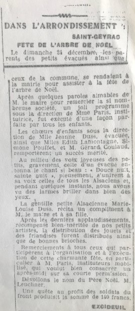 Le chœur d’enfants sous la direction de Mlle Jeanne Duss, évacuée, ainsi que Mlle Edith Lamontagne, Simone Pouffet, et M. Gérard Coulaud remportèrent un succès mérité.