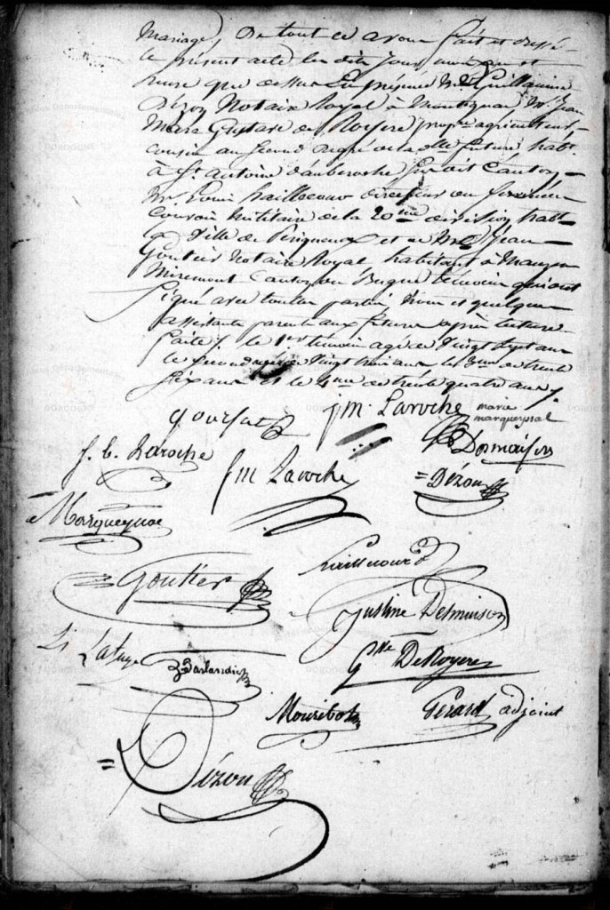 Elle se marie avec Jean Baptiste Camille LAROCHE (1797‑1875), avocat, fils de Jean Michel LAROCHE (1756‑1836) et d’Elisabeth Louise Marguerite DUBREUILH de LA BRUYERE (1771‑1805) le 9 août 1819 à Saint-Geyrac (Dordogne). Jean Baptiste Camille a 22 ans et Marguerite Justine a 20 ans. Ils sont cousins . Voici leur acte de mariage.