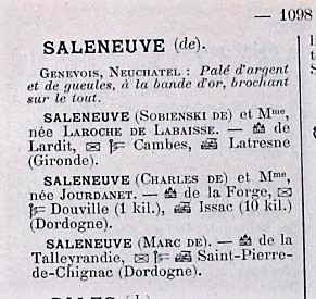 Au dos d’une carte postale reçue par Elise Gaillard demeurant à Landrevie et employée dans la famille de Saleneuve, on remarque la date du 24/11/1908 et l’adresse : château de Lardy. A cette date Charles François Sobienski de Saleneuve est décédé. Elise est donc l’employée de Marc de Saleneuve. Une enveloppe de 15/03/1908 est adressée à Elise (Maria) chez les de Saleneuve à la Taleyrandie. Leur domicile porte le nom de château. On l’entend encore dénommé ainsi par les personnes âgées.