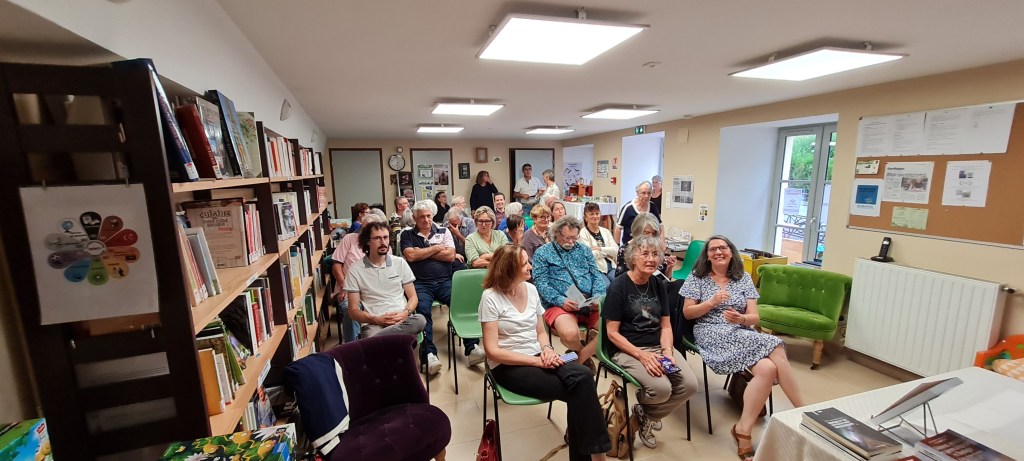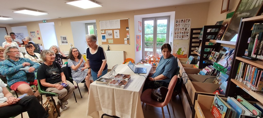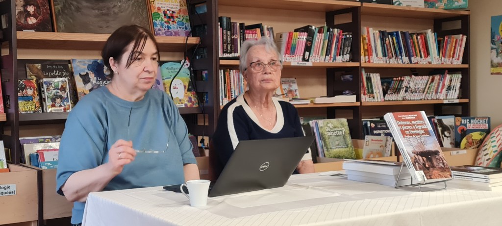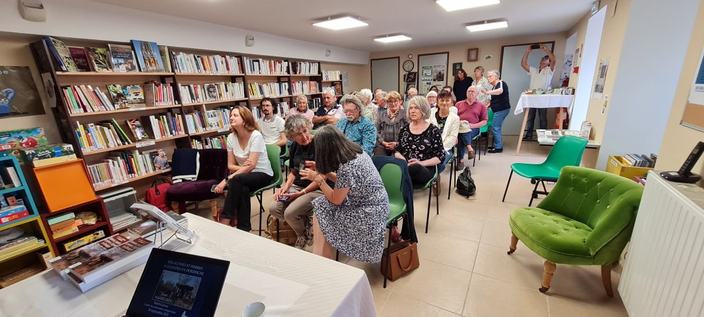 -la bibliothèque pour la conférence d’Anne Hambücken, la présentation et la dédicace de son livre « Dolmens, menhirs et pierres à légende en Dordogne » coécrit avec Jean-Sébastien Pourtaud.