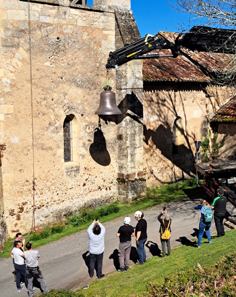 Ce mardi 19 mars 2024, la cloche a été hissée dans son beffroi. Après quelques travaux sur ce dernier, elle retrouvera sa place et devrait reprendre sa mission, c’est à dire « sonner » dès le 28 mars à 19h…