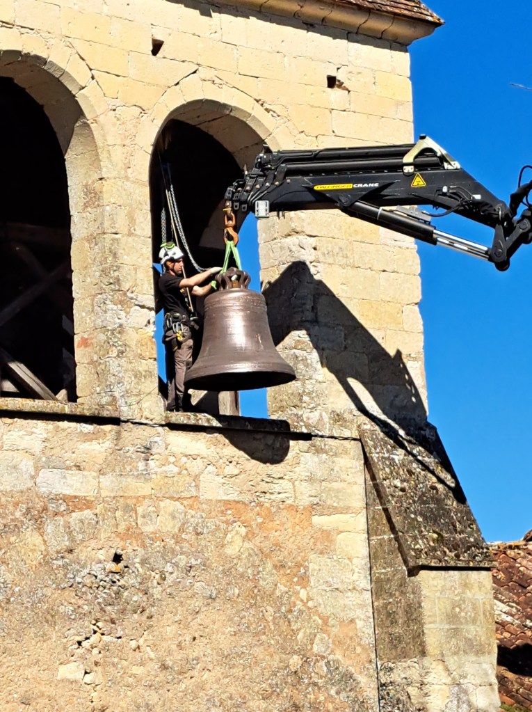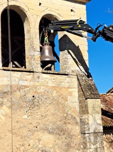 Le 23 octobre dernier, la cloche de l’église de Saint-Geyrac était décrochée pour restauration (voir plus loin quelques photos de cette opération technique spectaculaire).
