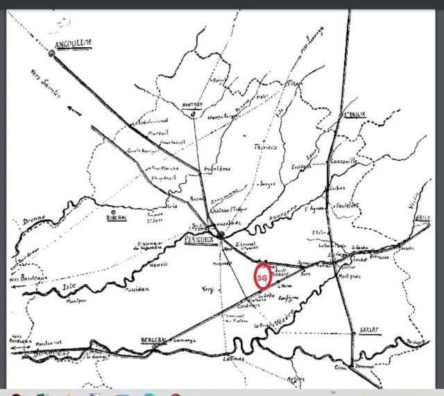 Carte extraite de : « Le réseau d’Agrippa dans le département de la Dordogne du Docteur Trassagnac ». Nous y avons situé approximativement Saint Geyrac .