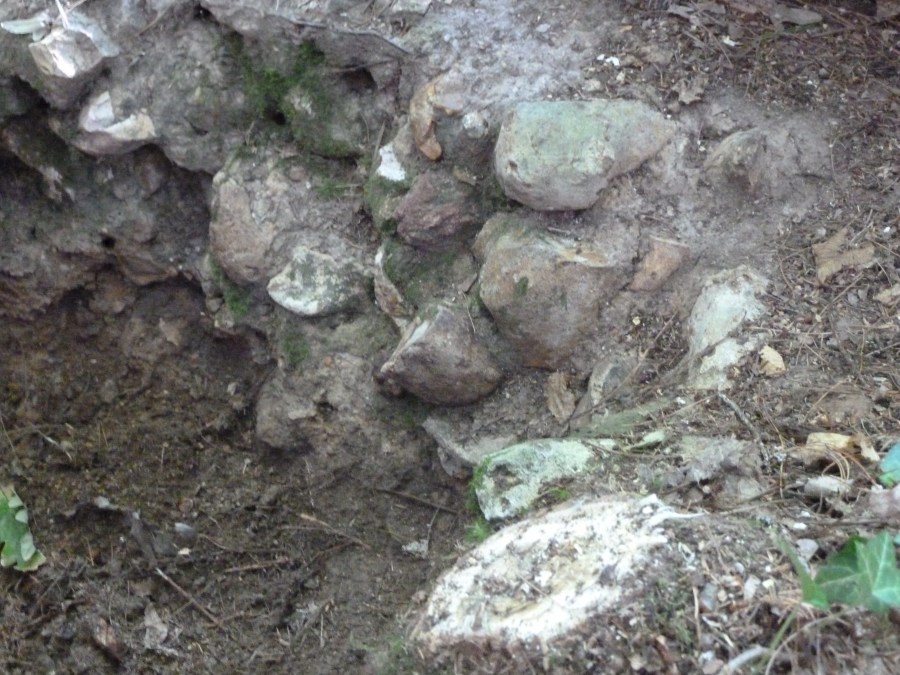 Philippe et Damien pensèrent tout de suite à une tranchée naturelle aménagée par l’homme. En effet, on dégagea par endroit, le long des flancs, un bâti semblable à celui sous le dolmen, construit probablement pour éviter les éboulements possibles par écoulement des eaux, car le sol est humide. On eut bientôt la certitude que le fond de la tranchée était une dalle naturelle qui fut utilisée comme sol par les hommes.