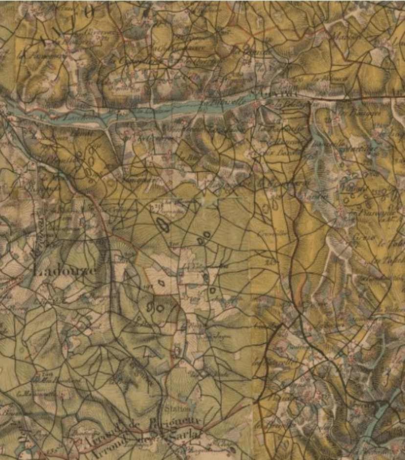 On voit très clairement que la partie comprenant ces hameaux a été découpée sur la carte de Saint Geyrac où les mots ont été terminés à la main. Le morceau ajouté sur la carte de Rouffignac n’est pas au bon endroit !
