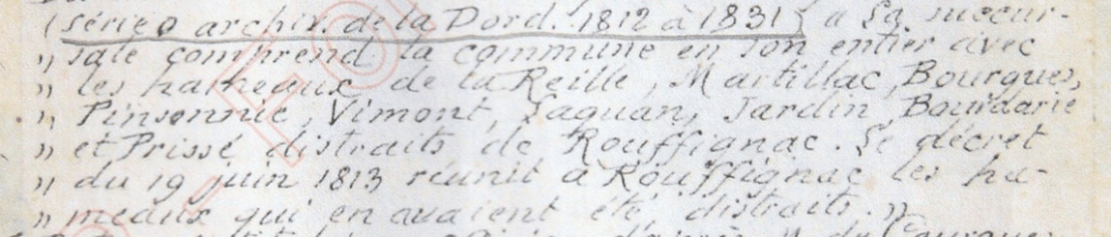 Transcription: « La succursale comprend la commune en son entier avec les hameaux de la Reille, Martillac, Bourgues (Les Bouyges), Pinsonnie, Vimont, Laquan, Sardin, Bourdarie et Prissé distraits de Rouffignac. Le décret du 19 juin 1813 réunit à Rouffignac les hameaux qui en avaient été distraits. »