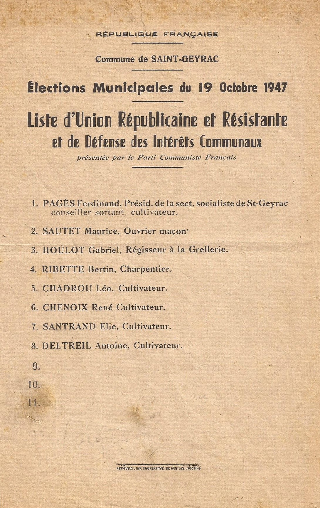 D’après la loi du 5 avril 1884, les conseils municipaux comprennent 10 membres lorsque la population de la commune est inférieure à 500 habitants ; c’est le cas de Saint-Geyrac en 1945 (432 habitants recensés en 1942, 375 en 1946).