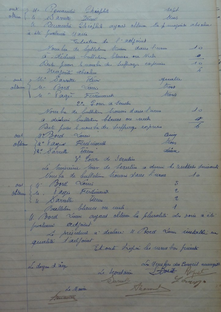 Lors du conseil municipal du 13 mai 1945, les conseillers élisent le maire : M. Renaudie Théophile et son adjoint : M. Bord Louis