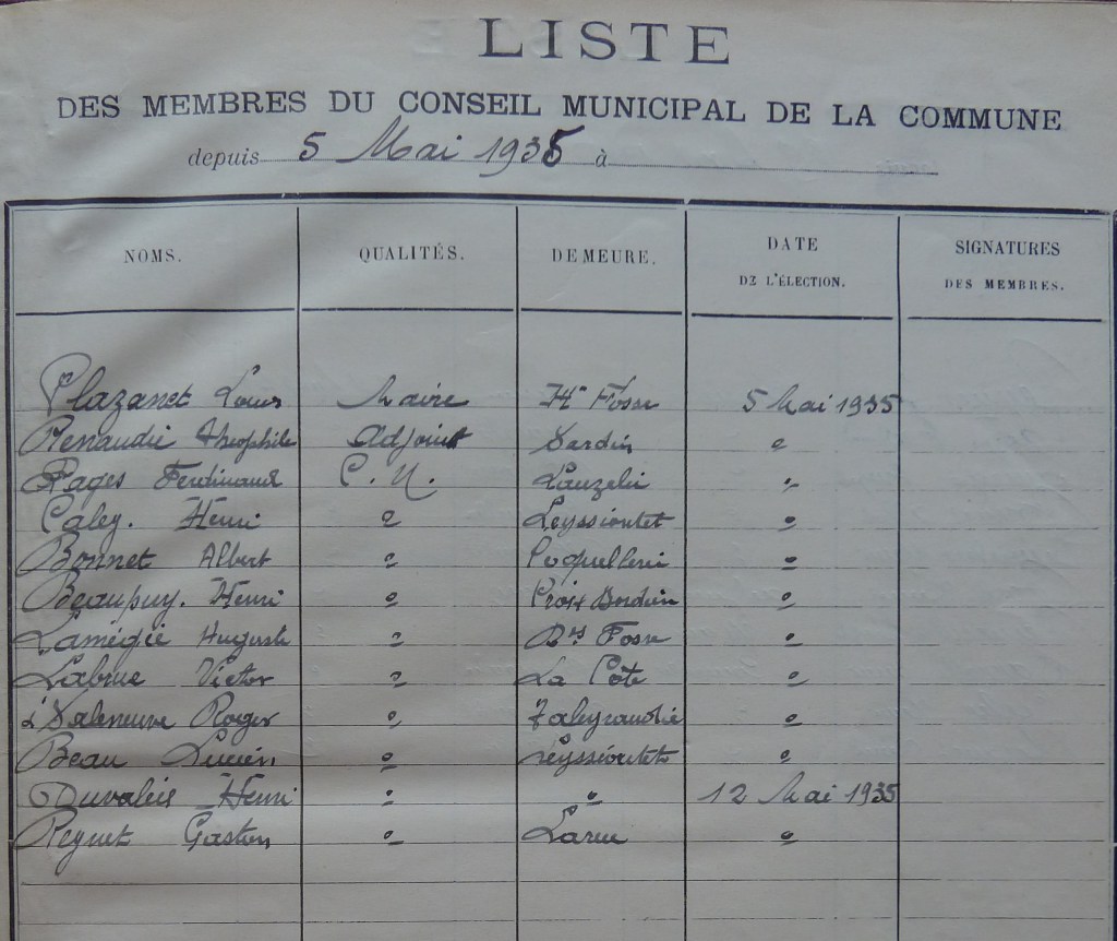 Les élus municipaux pendant la guerre ont été élus en 1935 et maintenus en 1940 avec les réserves évoquées plus haut. Voici le tableau de ces élus: