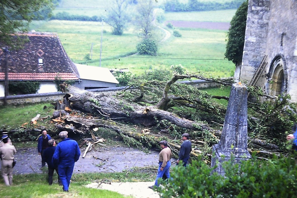 “ … C’était le 30 août dernier. Ce dimanche, une animation inaccoutumée régnait aux abords de la vieille église. On y célébrait un baptême. Jusque-là rien de très normal. Mais il faut croire que c’était un personnage important, car à l’issue de la cérémonie la cloche s’est mise à sonner (jusque-là rien encore que de très normal). Mais lorsque la dite cloche ayant commencé son office à midi trente s’en est donné à cœur joie jusqu’à 13h40, d’aucuns trouvèrent qu’ il y avait un peu d’abus. Que faire ? Pas de clé de l’église à portée de main ; notre bon M. Dougnac1, un peu dur d’oreille, n’ayant pas entendu ne pouvait intervenir ; couper l’électricité, encore fallait-il pouvoir atteindre le compteur à l’intérieur ! Et cette maudite cloche qui semblait narguer tout le monde avec ses interminables carillons ! En désespoir de cause, on téléphone au curé sis à 9 kilomètres de là espérant un miracle de sa part vu la place qu’il occupe auprès du tout puissant. De miracle point n’était besoin étant donné qu’il s’agissait tout simplement d’une défaillance de la technique humaine, laquelle avait malencontreusement bloqué le système d’arrêt du mécanisme. Ouf ! les habitants purent alors retirer les boules Quiès de leurs oreilles et les chiens cesser de hurler ; mais on avait eu chaud et en d’autre temps, on eût pu croire au tocsin annonçant une catastrophe.