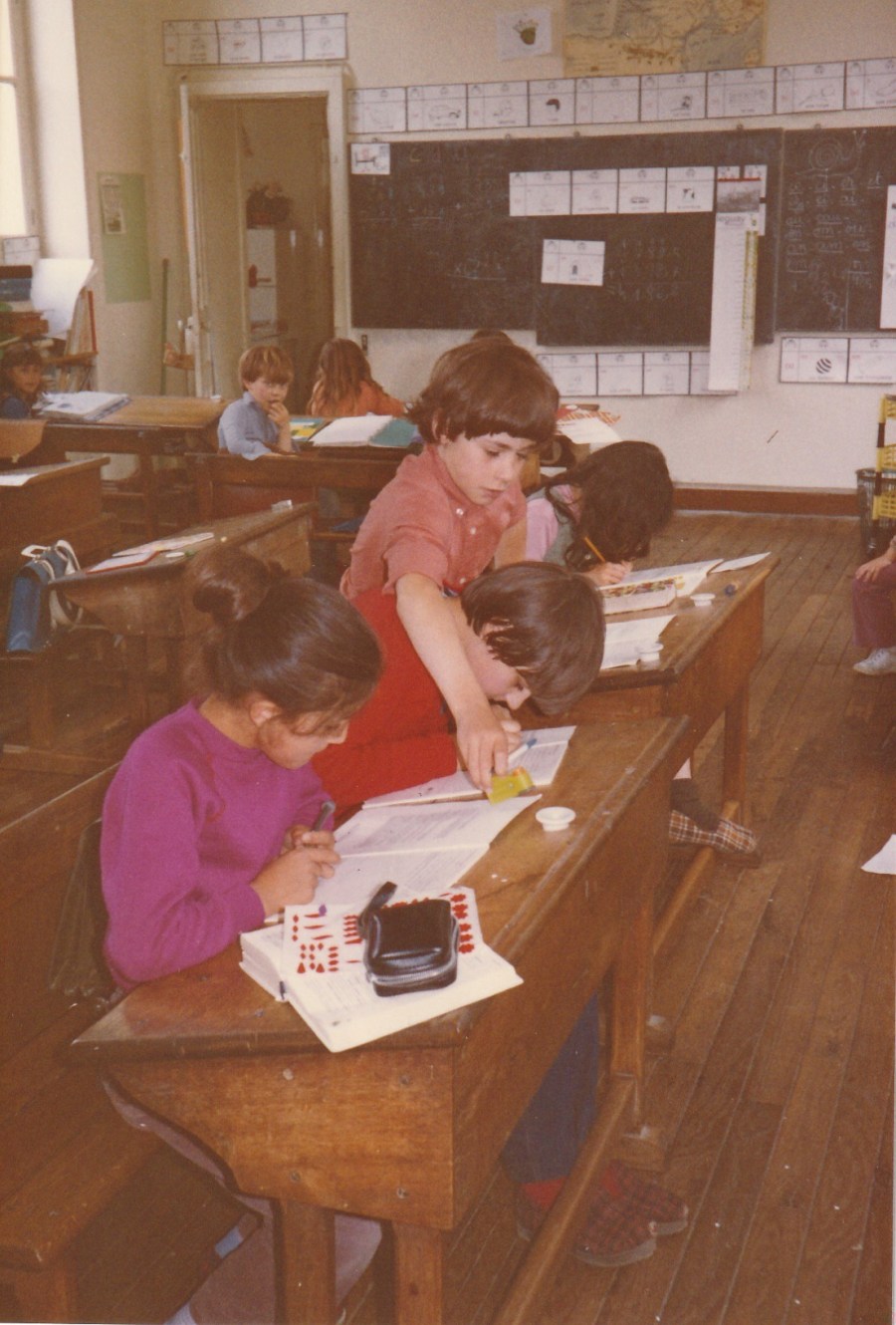 Photo mise en avant : La classe unique de Saint Geyrac 1976-1977. Au-dessus des tableaux, les enfants avaient créé une frise historique racontant l’Histoire de la Commune.