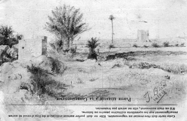 Envoi de Bernard Goerig : deux dessins de Joseph Duss exécutés sur des cartes de « correspondance des Armées de la République », pendant la guerre de 14-18 alors qu’il était en Algérie.