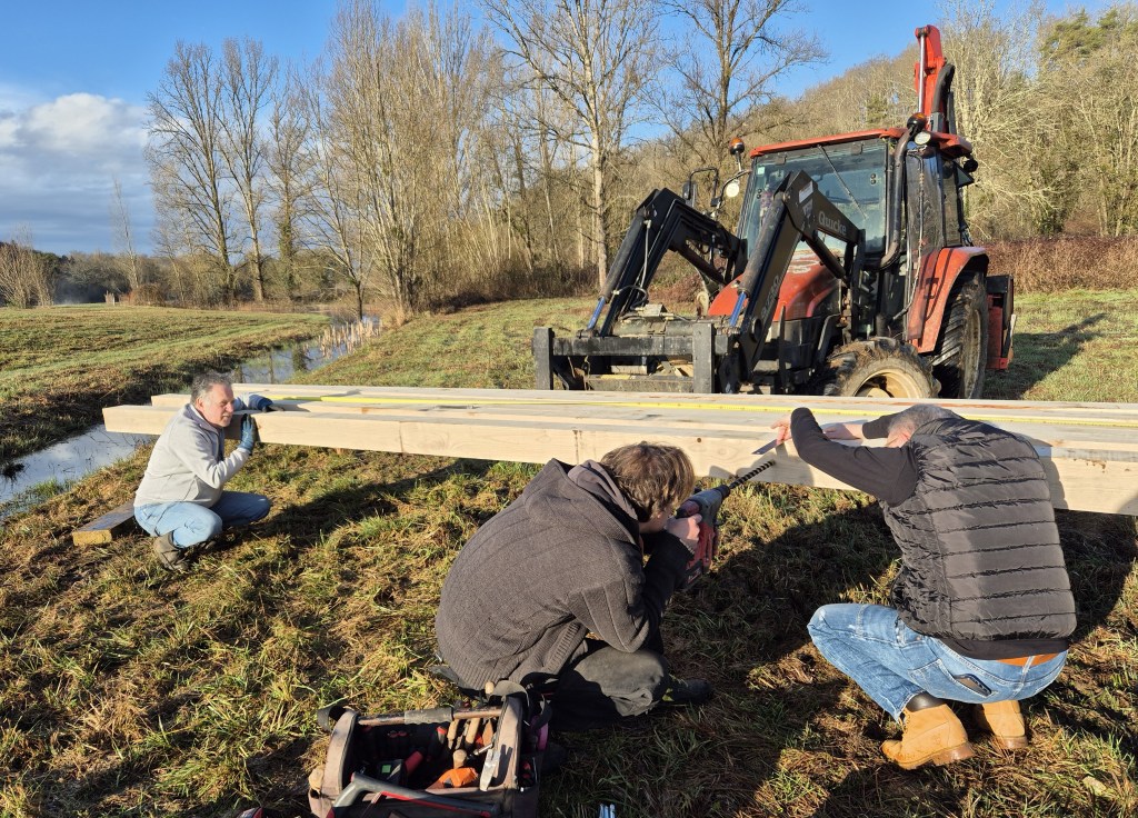 Au mois de février 2025, par une matinée assez glaciale, une équipe chevronnée de gars costauds a procédé à l’installation du tablier en bois dans la zone humide. La conception de cette base a été réalisée par Julien Foglia (un enfant du pays). Avec l’aide de Gaëtan et de son tracteur, de Gaby et Jérôme, 6 longs madriers de bois, au poids conséquent, ont été transportés sur le lieu d’implantation du pont.