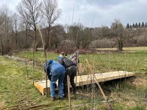 Samedi 15 mars, dans la zone humide de Saint-Geyrac, du côté du verger conservatoire, il a été procédé à la plantation du garde-corps du pont, en osier vivant, avec Serge Mazeau.