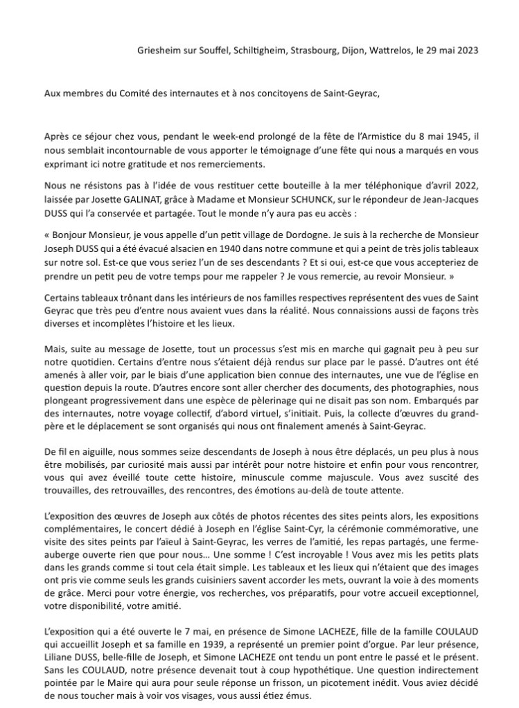 A la fin du mois de mai 2023, après son départ du Périgord, André Untersinger nous a envoyé une très jolie lettre de remerciements que l’on peut lire ci-dessous: